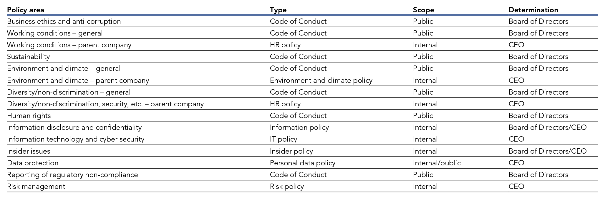 Industrivärden’s policies ensure that the Board’s and CEO’s responsibilities for managing sustainability-related impacts, risks and opportunities are integrated into Industrivärden’s governance structure. The framework for Industrivärden’s sustainability work is stipulated in the Company’s Code of Conduct. Sustainability and corporate governance policies are also in place to direct the business. The CEO is responsible for implementation of the Company’s policies. All policies are reviewed annually and revised as needed. Necessary adjustments are made based on operational requirements, external requirements and changes in the operating environment. Key policies and guidelines are presented in the table below.